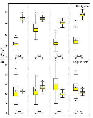 Fig. 1. Comparison of bootstrapped biomass distributions for rock and English soles from Hecate Strait research surveys in June (S) and commercial tows in the 2nd quarter (C). A circle in each boxplot indicates the corresponding biomass estimate.
